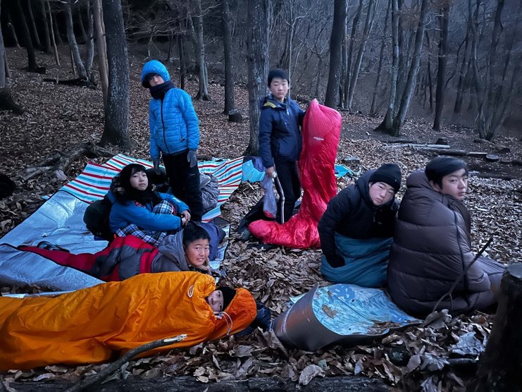 まずは山頂の森に、自分たちの手でゲル風の基地をつくるところからスタート!